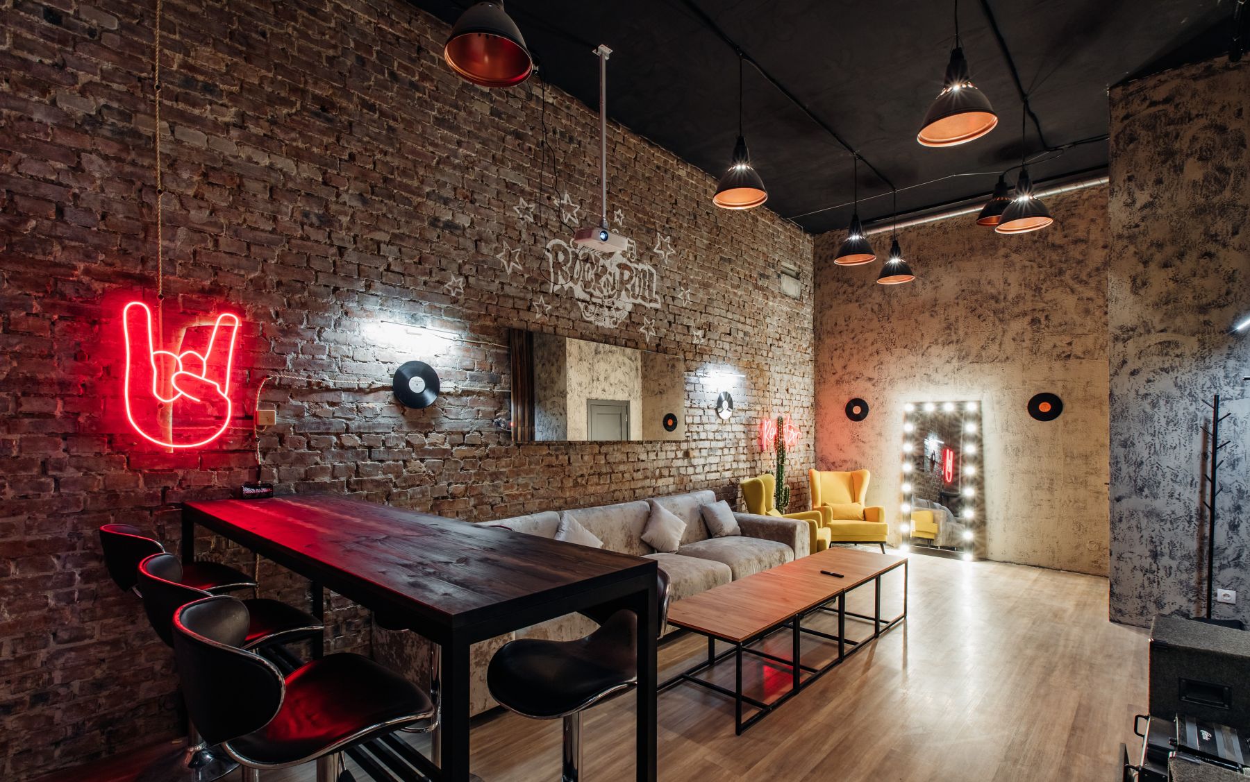 Этот зал — сама дерзость и энергия. Грубые кирпичные стены, пронзительный красный неон и аутентичные рок-элементы создают неповторимую атмосферу музыки и свободы. Здесь нет места полумерам — только настоящий уличный стиль и дух бунтарства.